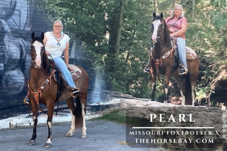 Pearl is a 12-year-old mare whose Sire is a Rocky Mountain and Dam is a Missouri Fox Trotter. With this cross, Pearl has a nice, smooth, fun gait. If you’re looking for an enjoyable ride that willingly goes anywhere you ask, Pearl is your girl. We have ridden Pearl in the mountains, on the road, and taken her to many shows. Pearl is sure-footed on the trails and willingly crosses creeks, logs, ditches, and will swim across the water if you ask her. As you can see in the videos, Pearl is very easy in the mouth, as we have ridden her with and without a bridle, and she is very responsive to your cues to stop, turn, side pass, and back up. Several different riders have ridden Pearl and it has never been a problem. Pearl stands quietly tied in the cross ties or to the trailer. The kids have shown her in costume classes and had the best time. She takes it all like a pro. Pearl loads great hauls easily and is a champ to shoe, stands perfectly. Don’t miss this fun, beautiful ride! OPEN BIDDING ON THEHORSEBAY.COM ENDS ON 8/20 @ 5:30 PM CT. More information is available on the website, including an UTD vet inspection, Coggins, video, images, and the owner\'s contact information to ask questions, request information, or make arrangements to come to visit.